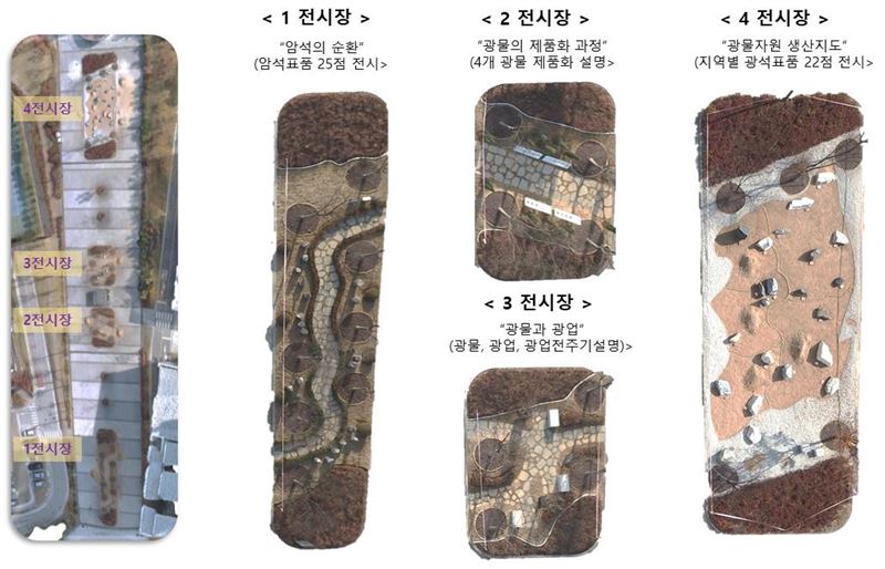 광물이음길은 약 155m에 걸쳐 암석의 순환, 광물의 제품화 과정, 광물과 광업, 광물자원 생산지도 등 총 4개의 야외 전시장으로 구성돼 있다.철광, 몰리브덴광, 석회석, 규석 등 국내에서 생산되는 광석을 포함해 화성암, 퇴적암, 변성암 등의 암석류 표본 50여 점이 전시돼 있다.