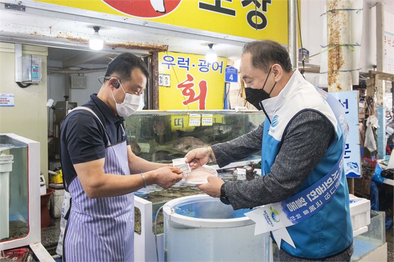 김호빈 한국중부발전 사장(오른쪽)이 보령 전통시장에서 장을 보고 있다. (c)한국중부발전