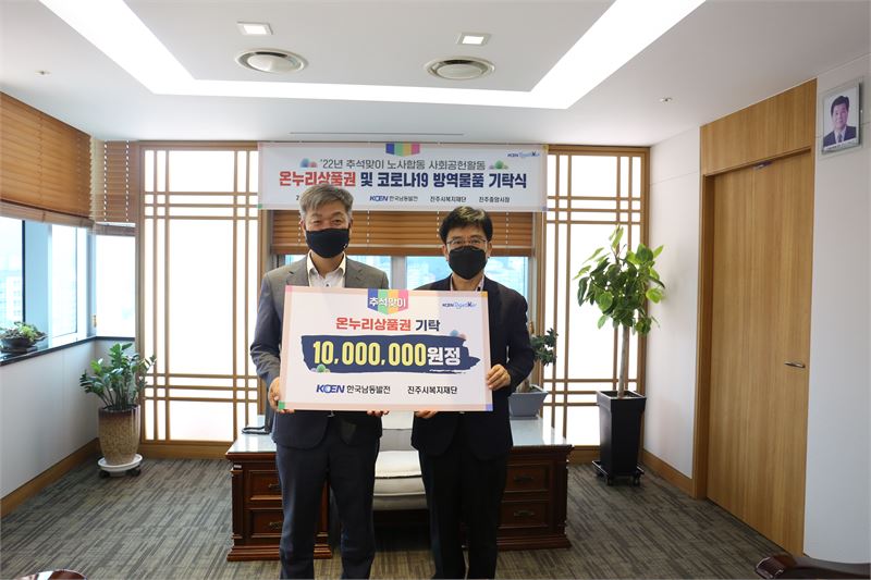 한국남동발전은 추석을 맞아 노사 합동으로 진주시복지재단에 온누리상품권 1000만원을 기탁했다.