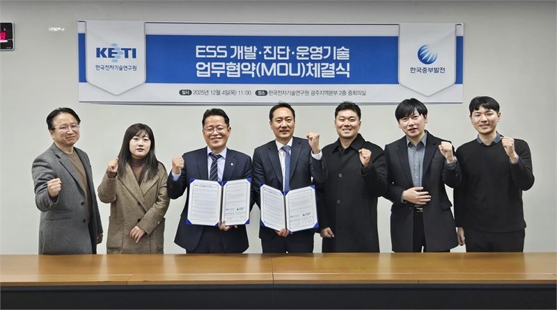 한국중부발전은 4일 한국전자기술연구원 광주지역본부와 ‘실증데이터 기반 에너지저장장치(ESS) 수명 예측 기술개발 연구 업무협약’을 체결했다.