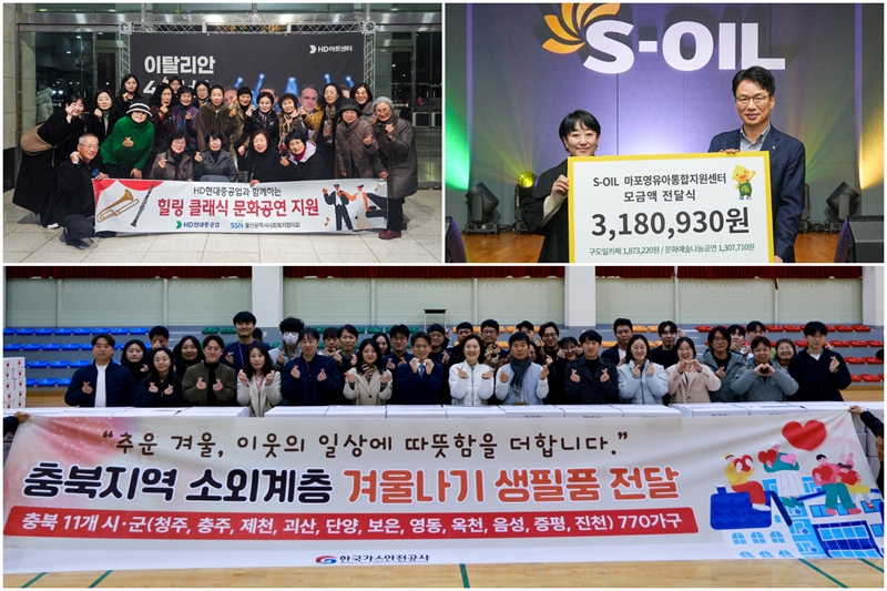 HD현대중공업은 울산 동구청을 통해 독거 어르신 200세대에 겨울 이불을 전달하는 한편, 평소 문화생활을 향유하기 어려운 복지시설 이용자 40명을 클래식 공연에 초청해 정서적 위안을 제공했다. 에쓰오일은 서울 공덕동 본사 앞 사옥 공간을 활용해 운영한 카페에서 시민들로부터 모은 318만원의 성금을 지역 영유아 복지 단체에 기부하며 10년 넘게 이어온 나눔 전통을 실천했다.
