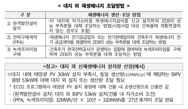 에너지공단 녹색건축센터는 지난달 24일 이같은 내용의 ‘제로에너지건축물(ZEB) 대지 외 재생에너지 활용 시범사업’ 모집 공고를 냈다.